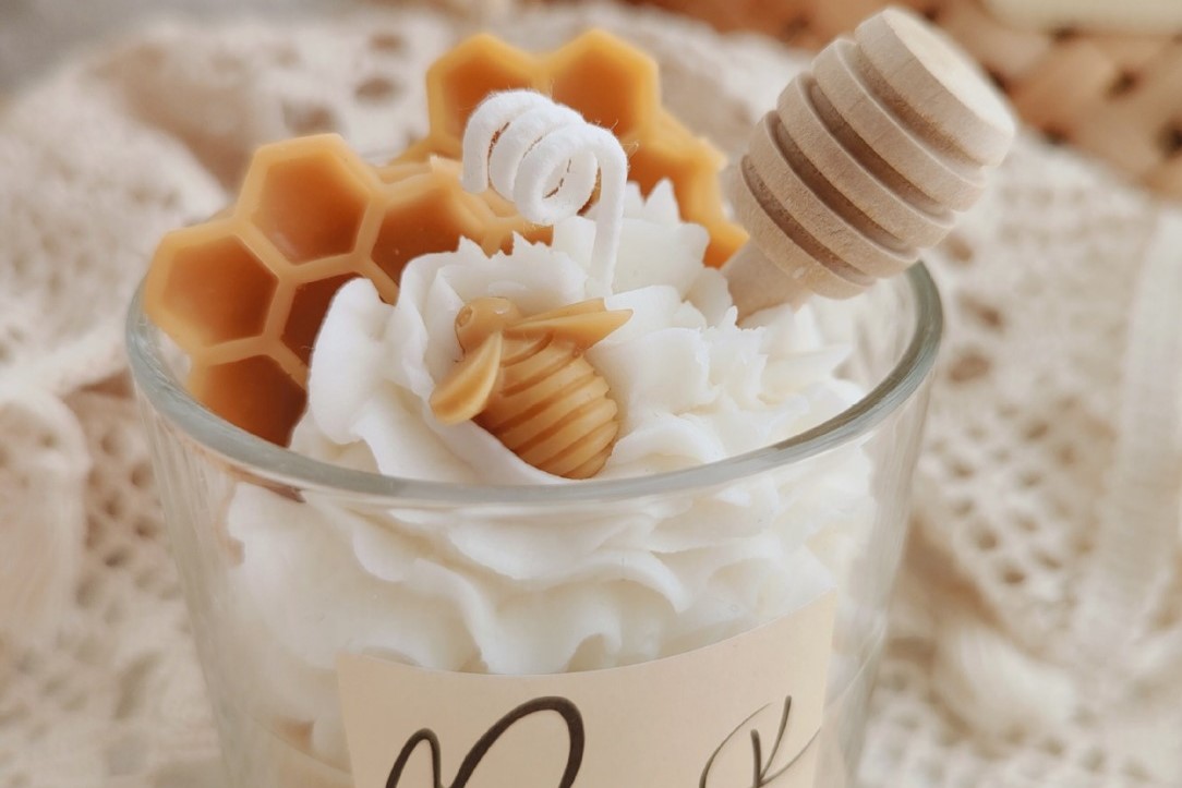 Indulge in the enchanting aroma and aesthetic appeal of our Honeycomb Cream Cup Shaped Scented Candle.